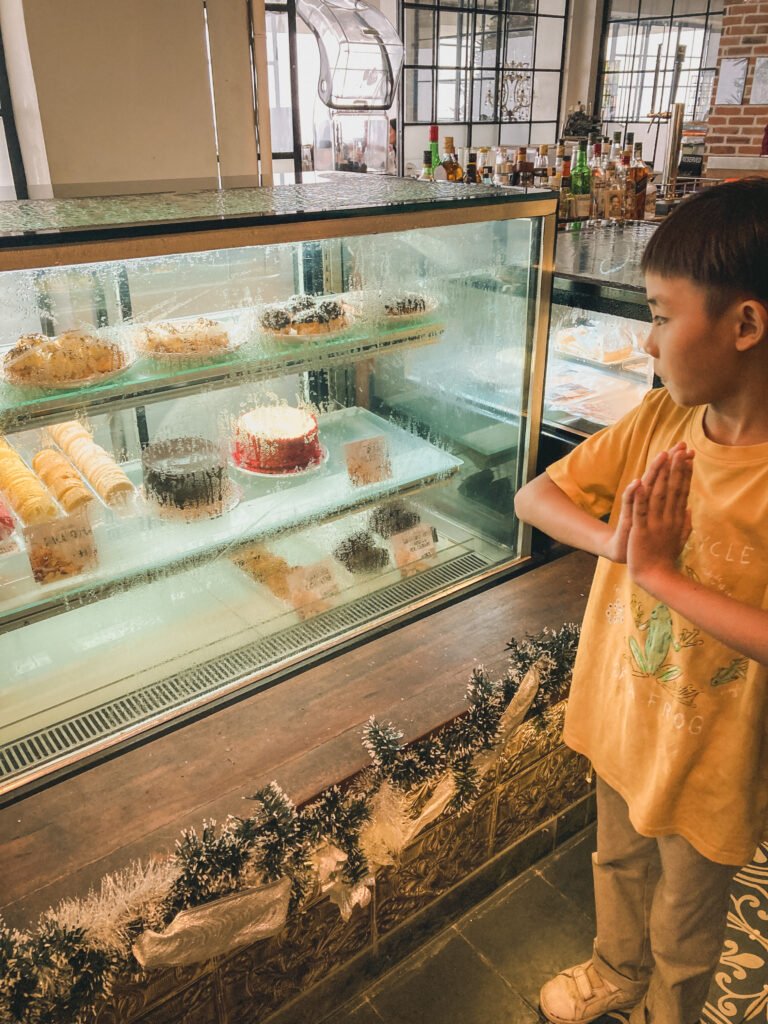 No birthday celebration would be complete without a cake. I walked him around the display, asking which flavor he wanted. I quietly suggested the red velvet, but he confidently pointed to the chocolate. I ordered a single slice just for him and he enjoyed every bite.